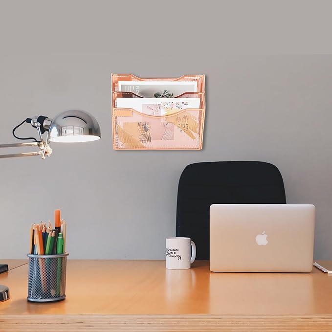 EASEPRES 3 Pocket Mesh Hanging Wall File Organizer, Wall Mounted Mail Paper Document Folder Holder, Clipboard Storage Organization Magazine Rack with Nametag Label for Office Home School, Rose Gold