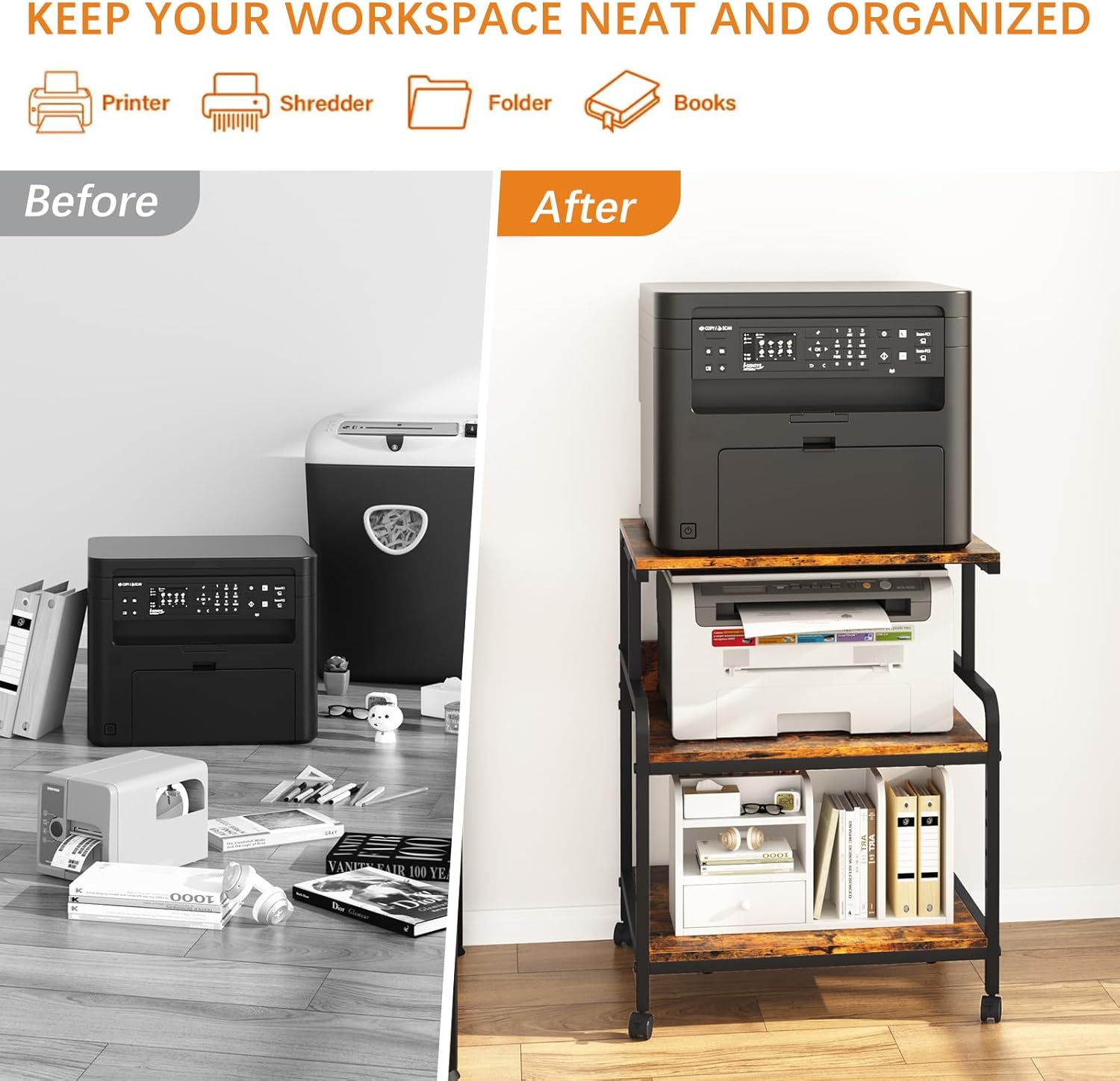 - 【Large Storage Space】:This 23.6 x 18.9 x 29.5 inches printer cart features 3 layers of ample storage space. Can be used to store printers,scanners,fax machines as well as documents,books,stationery,printer paper,etc., is the perfect way to keep your office clean and tidy!
