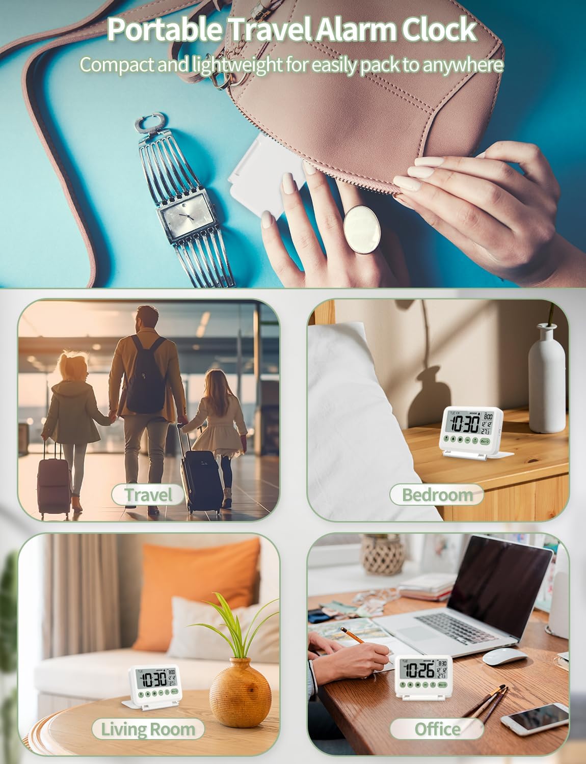 - γSmall and Light Basic Bedside ClockγThis foldable digital clock is made of high quality ABS material. The modern and minimalist look makes it suitable for bedroom, office, living room, dormitory, dinning room or any other room. The pocket size (4"*3.15"*0.75") makes it a portable alarm clock that can be used on your nightstand, table, desk or keep it in your handbag when you travel. It is a ideal gift for adults, children, teenagers, students and kids