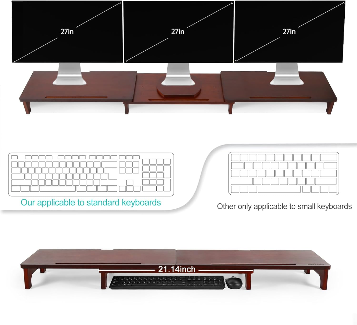 - 【Triple Monitor Stand for Desk】The three monitor stand is built up with 3 shelves, which can hold three 27" computer monitor .Much space is available for matching multiple devices - PC/laptop/printer/books.You can also set up the desk as your need.