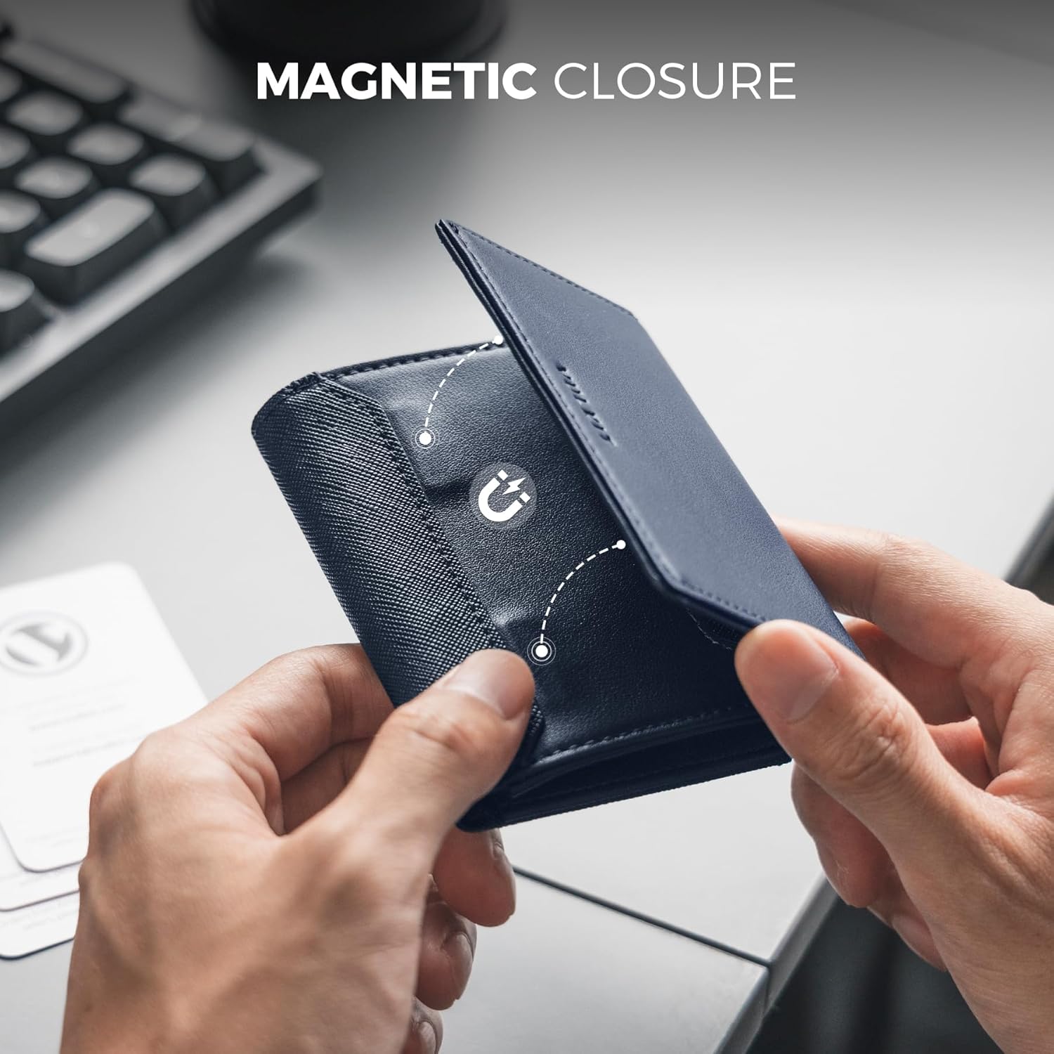 - LARGE CAPACITY & PRACTICAL: Holds up to 40 business cards or 20 standard credit cards. There is a concealed card slot on the inside and a visual ID slot on the outside for your ID card or driver's license. Magnetic closure keeps your cards in place well.