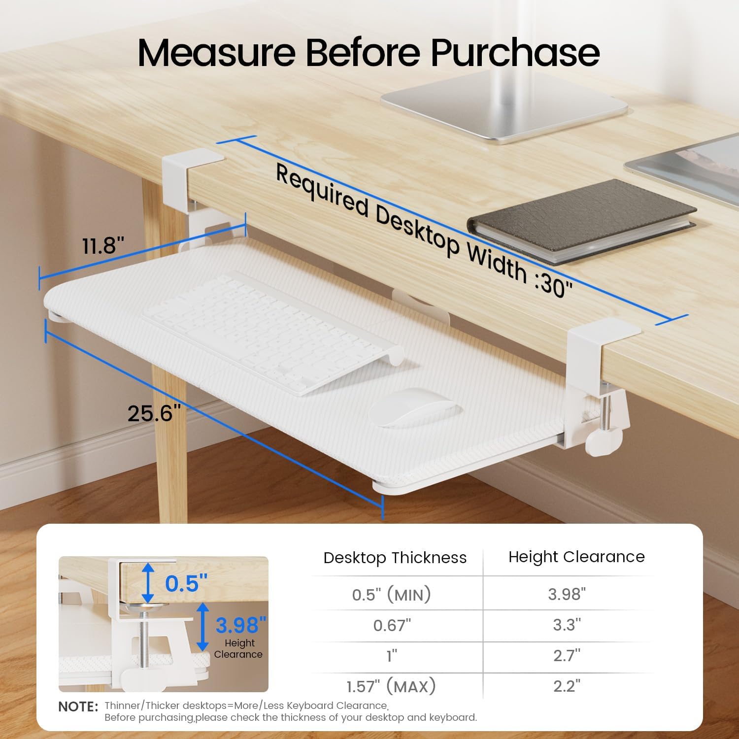 - IMPORTANT β CHECK COMPATIBILITY: This is a LARGE-sized keyboard tray: 26β³ x 11.4β³.Please measure your desk thickness and available space carefully before ordering,total clamp-to-clamp length is 30β³,supports desks 0.5β³ to 1.57β³ thick.