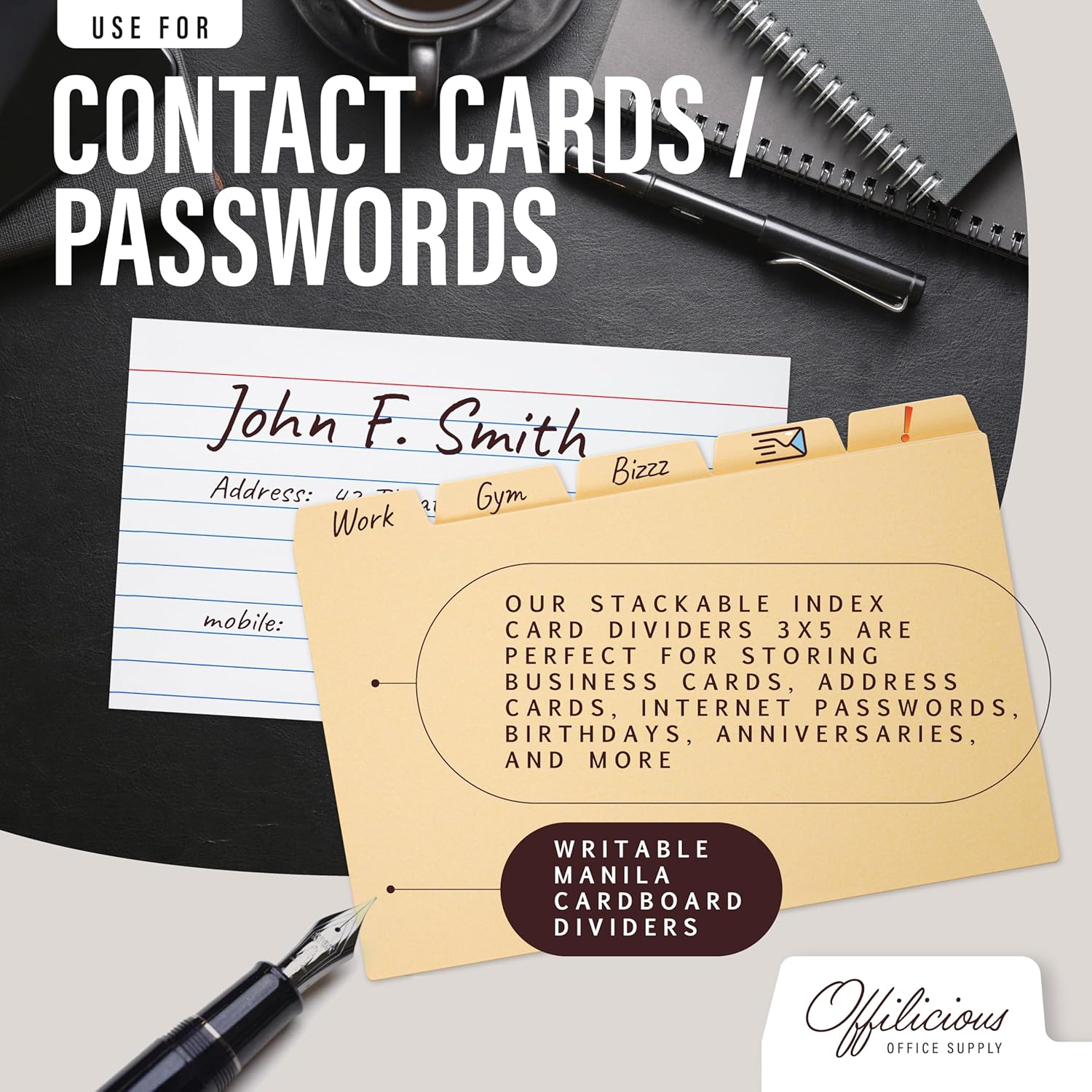 - AT OFFILICIOUS, WEβRE COMMITTED to providing the most QUALITY-CRAFTED index card organizer with dividers accessories. Our index card dividers 5x8 are made with THE BEST MATERIALS for TASTEFULLY DESIGNED, index card divider storage youβll love for YOUR OFFICE & HOME. If for any reason you arenβt satisfied with your alphabet dividers for index cards, weβre standing by to help!