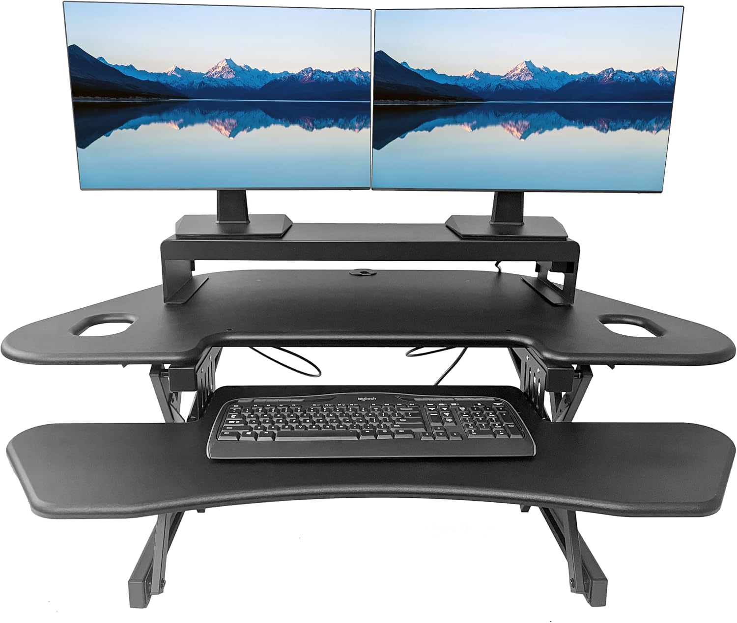 - Extra Large Work Surface - 45.5" wide by 23.25" deep desktop can hold up to two 32" monitors, while 40" wide by 13" deep detachable keyboard tray will hold a laptop and keep arms in ergonomic position to prevent strain while sitting or standing.