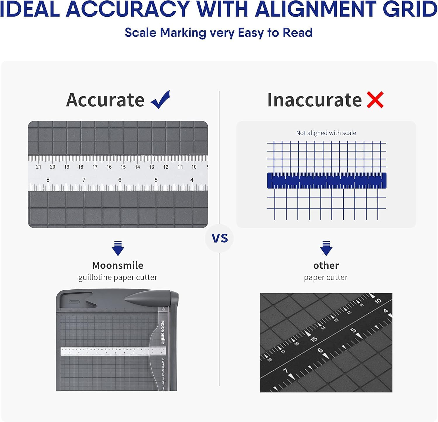 - Accuracy: A masterpiece of design with great cutting capacity; fadeless gridlines and rulers are precisely printed with dual scale (in cm and inch) for reliable alignment and perfect trimming; a sturdy 12" x 9" base and six anti-slip rubber feet ensure stable cutting on flat and hard platforms