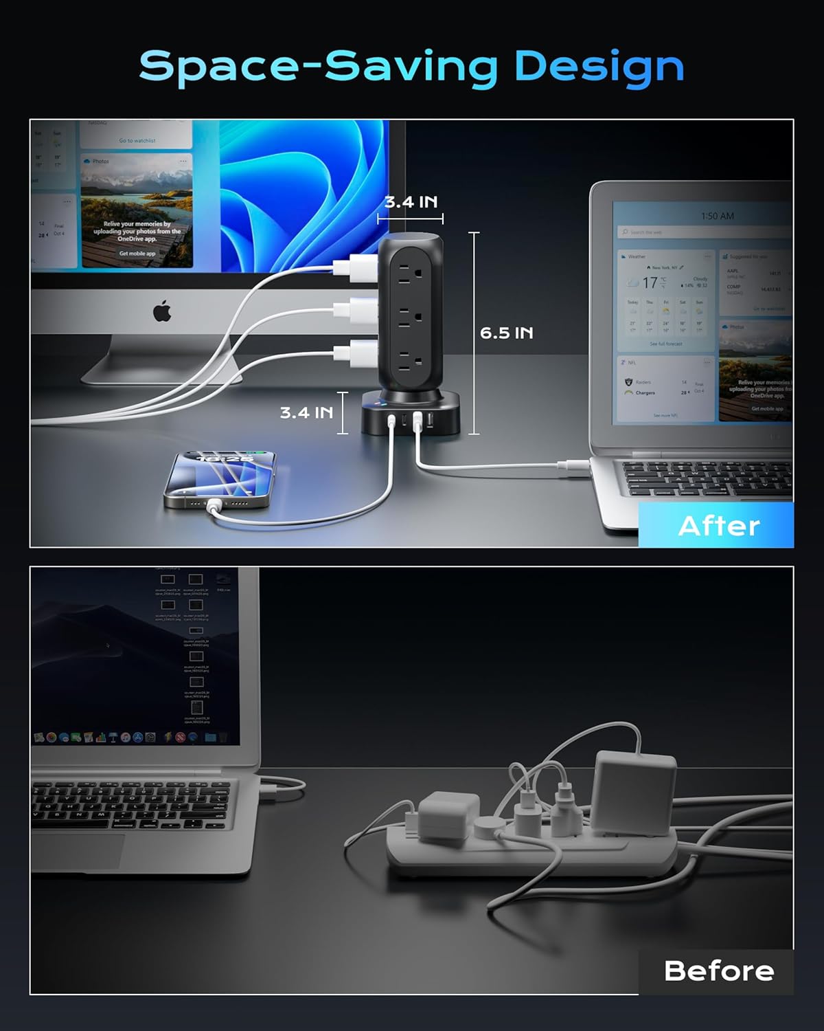 - 【20 IN 1 Power Strip Tower with USB】- This vertical power strip with USB ports features 12 AC outlets and 8 smart-charging USB ports(4 USB-C). It can charge 20 devices simultaneously without blocking, keep your desktop organized, widely use in home/office/dorm room. (Note: Please do not exceed the rated power 1875W ).