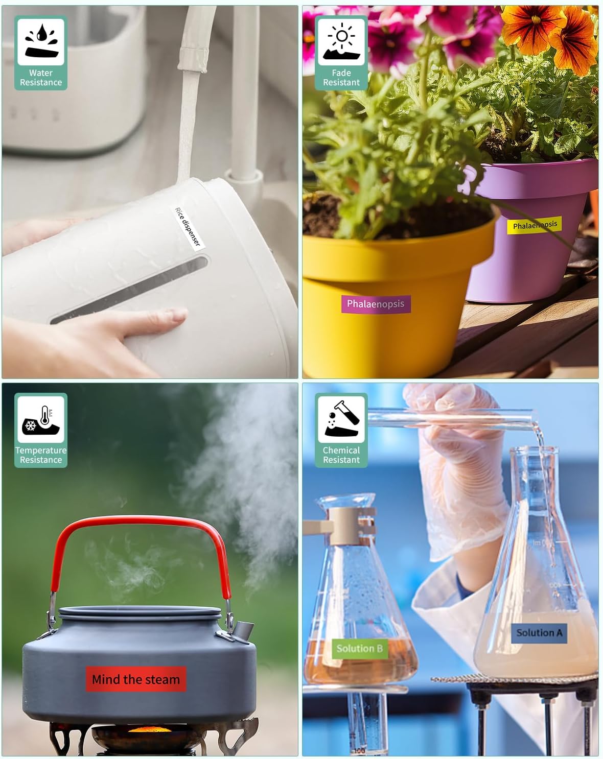 - Features: (1) Split-backing, making the 12mm label maker tape easy to peel and apply. (2) The tz 12mm 0.47" laminated tape is adhesion, resistant, temperature resistant, water resistant, chemical resistant, fade resistant, UV resistant, abrasion resistant, grease resistant, grime resistant, and corrosion resistant