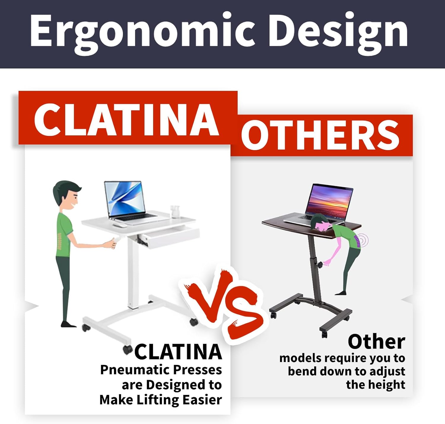 - γEASY TO INSTALL & PROFESSIONALγ: No need for extra mounting tools. We provide detailed manual and all the necessary hardware to help assemble this mobile laptop desk more quick and efficient. we provide worry-free 3-year warranty, and friendly customer service. Come and experience this CLATINA multifunctional mobile standing desk.