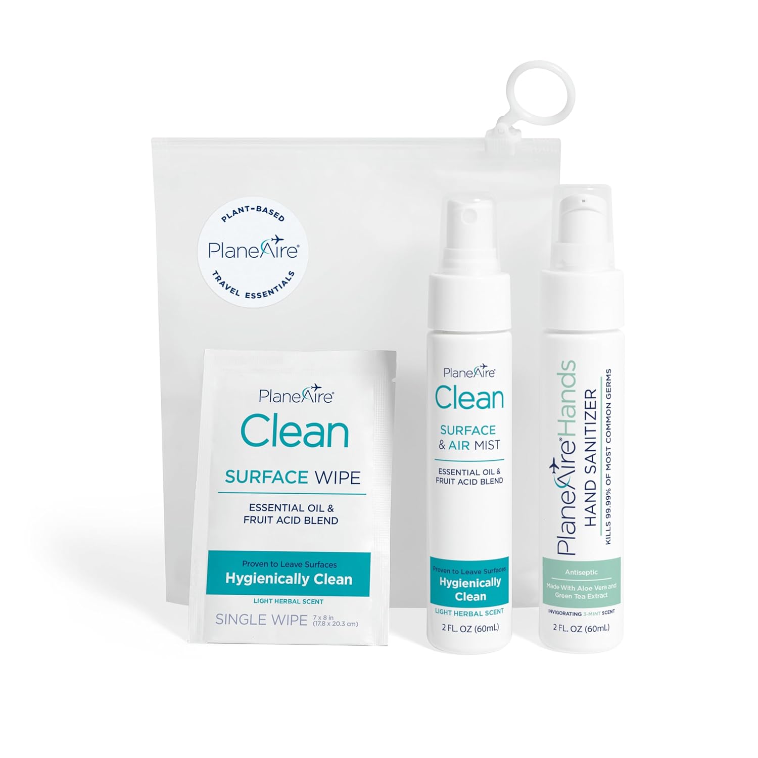 - 1-2-3 CLEAN: Spray, Wipe and Clean! Our travel kit contains 1 PlaneAire Clean Surface & Air Mist, 1 3-Mint PlaneAire Hands Gel and 6 individually wrapped PlaneAire Clean surface wipes.