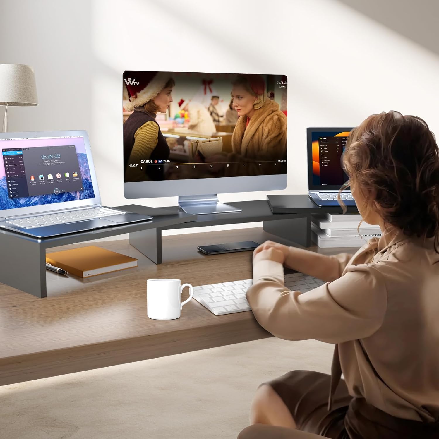 - PRODUCT PROFILE - 3 Desk Shelf Monitor Stand Riser dimensions 42.5x 235 x 4.1 inch (L*W*H), great for home or office, it can be used as a 2 monitor stand/riser, 3 monitor stand/riser, printer stand, riser for computer monitor, PC tower stand, laptop shelf, TV stand or even a desk shelf/organizer, also can be used as a shelf to hold books, manuals, magazines, desk accessories, framed photos, and so on. Total weight capacity up to 44 lbs.