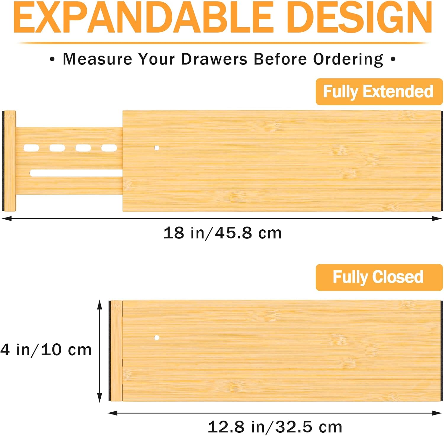 - EXPANDABLE SIZE TO FIT MORE DRAWERS: The drawer dividers are adjustable from 12.8'' to 18'' length, 4'' height.The dividers can be used vertically, horizontally or stacked to to meet various organizational needs.PLEASE MEASURE THE DRAWER SIZE BEFORE PURCHASE!