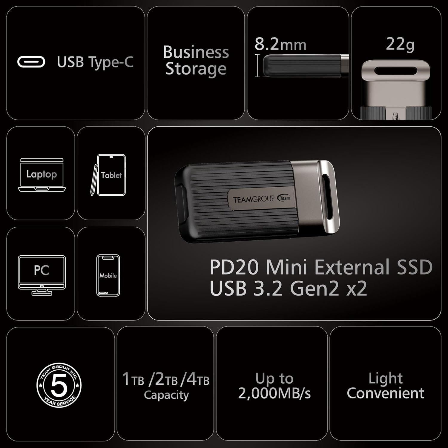TEAMGROUP PD20 1TB Portable External Solid State Drive SSD Read up to 2000MB/s USB 3.2 Gen2x2 Type-C Waterproof Dustproof IP54 TPSEG5001T0C102