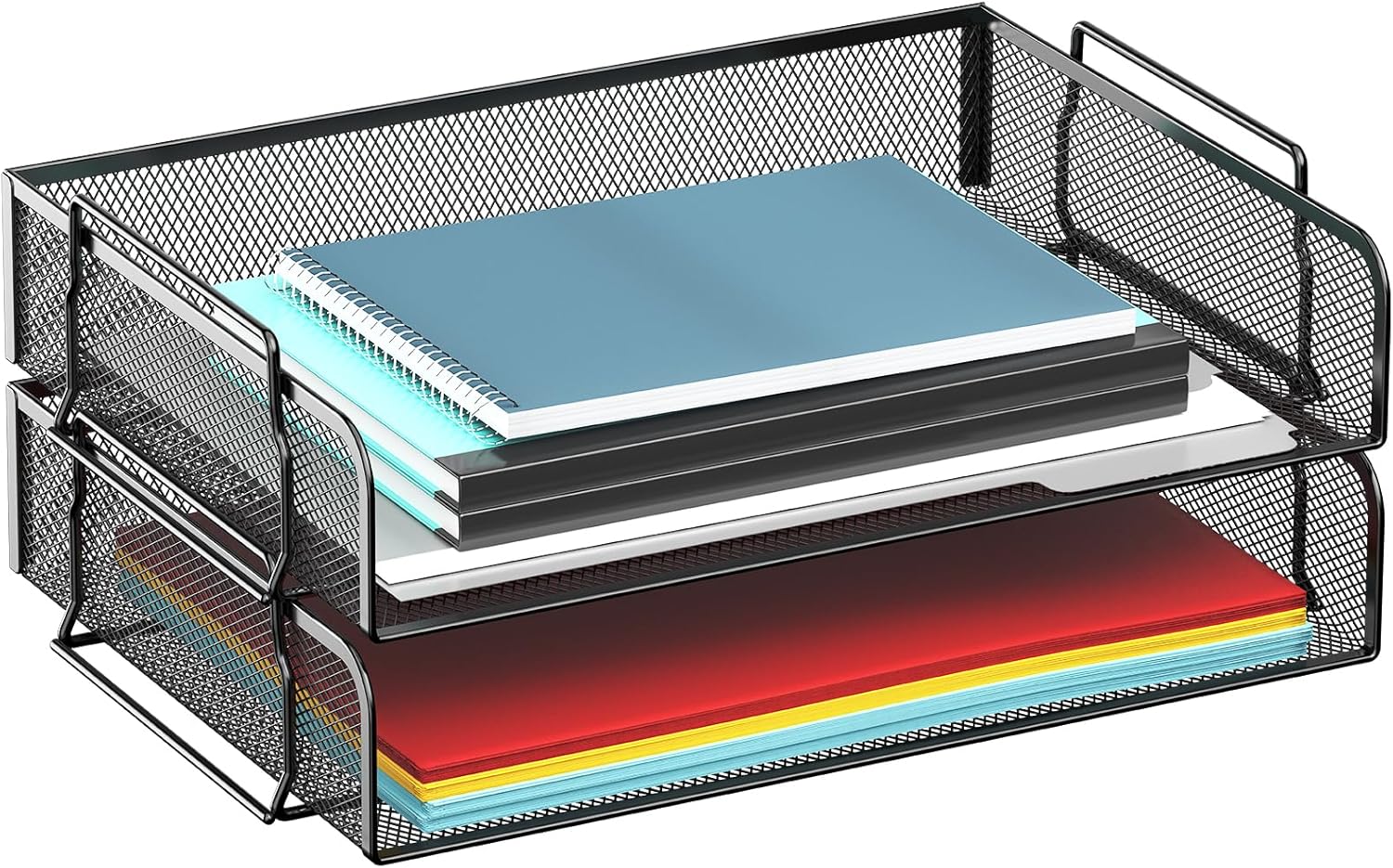 2 Tier Stackable Letter Tray, Metal Mesh File Storage Desktop Organizer for Home Office, Black