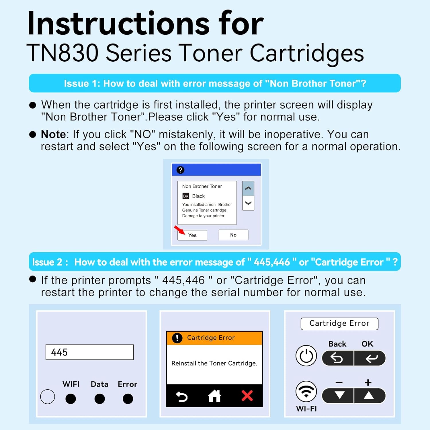 - γTN830XL Friendly TipγIf the printer displays '445,' '446,' or 'Cartridge Error,' please restart the printer to resume normal operation.