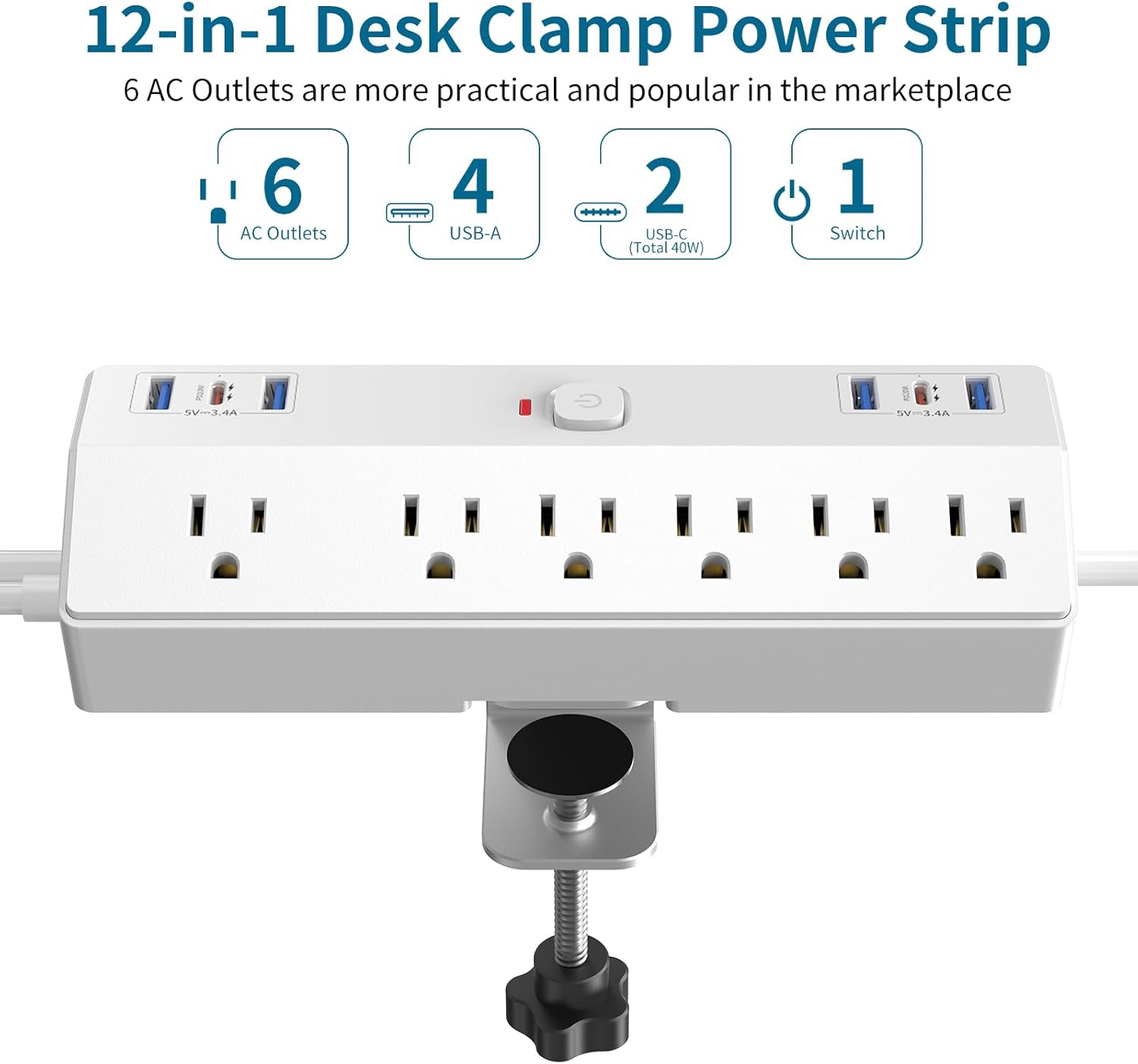- 【12-in-1 Desk Clamp Power Strip】-This Multi Outlet Plug desk power strip surge protector combines 6 AC Outlets (1625W 13A) and 6 USB Ports (4 USB-A, 2 USB C 20W) in a power station to provides power and charging for up to 12 electric devices from this single unit, easily relieve your electricity troubles.