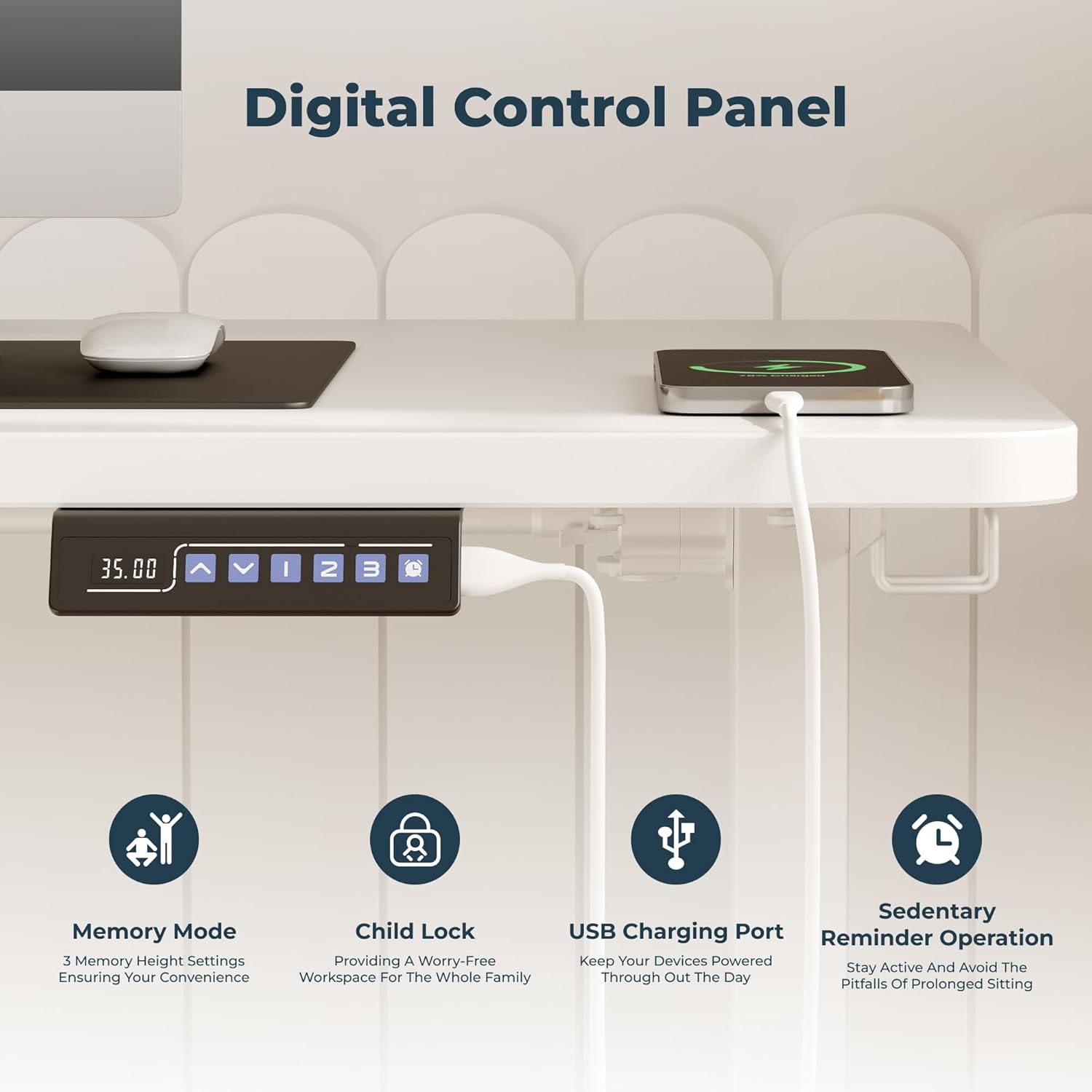 - Versatile Adjustable Desk: Elevate your workspace with a powered USB port, ergonomic reminders, and multi-functional hook. Designed for safety and organization, featuring cable management, child lock, and collision sensor, ensuring a family-friendly, secure environment.
