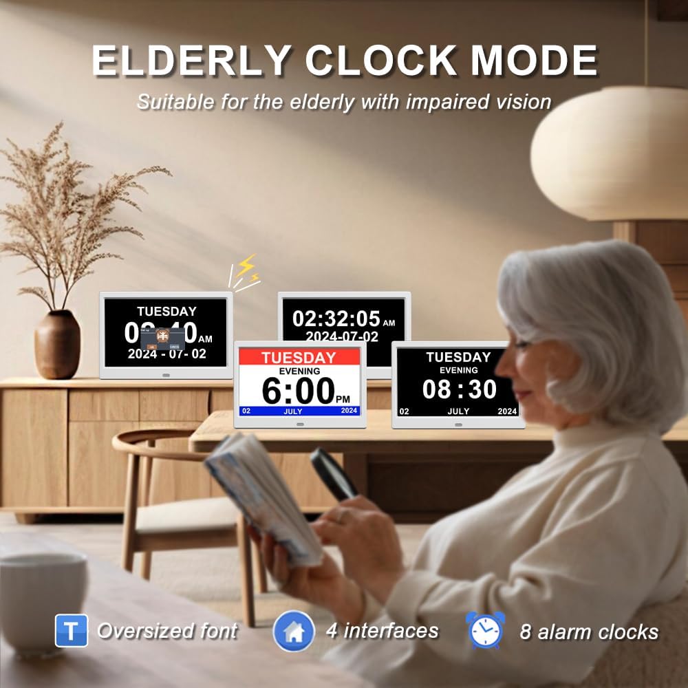 - γElderly Clockγ: It features an extra-large high-definition screen . The time, date, and day of the week are shown in large, non-abbreviated, andγ easy-to-read font, making it ideal for seniorsγ. Additionally, it includes 8 icon-based alarm groups for activities such as taking medication, exercising, and waking up. When an alarm goes on, the corresponding icon is displayed to remind you of the current activity. it has a voice time announcement feature that announces the time every hour