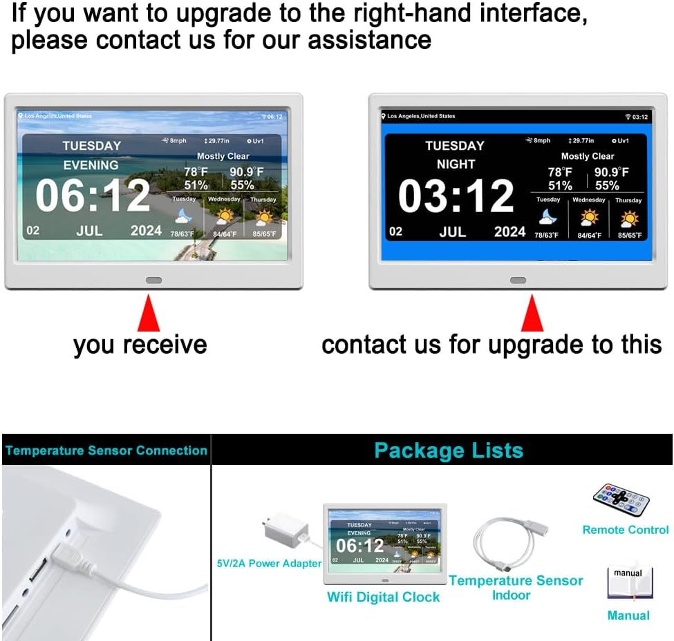 - γ2024 Newest developed, Multifunctional clockγ: β Network clock, β‘Weather clock, and β’Elderly clock. It can connect to network and display real-time weather forecasts, indoor and outdoor temperature and humidity, and a perpetual calendar. It features an extra-large font to display the time, date, and day of the week. built-in 8 alarm sets and announces the time hourly with voice prompts. has 8 OS languages