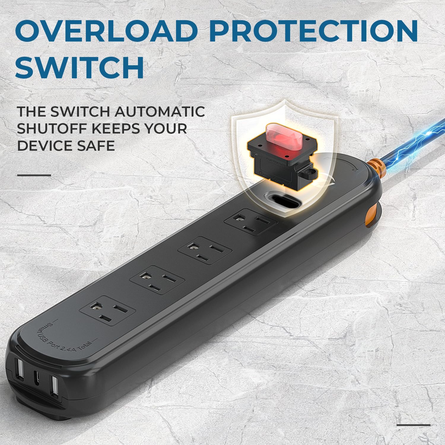 - Overload Protection Switch ON/OFF: The surge protector protects all connected equipment from voltage spikes, even during thunderstorms. The built-in circuit breaker shuts off when the total equipment power exceeds 1875W/15A, protecting you and your electronic equipment. Enclosure is made of 1382Β°F heat-resistant ABS+PC material to prevent overloads that can cause fires