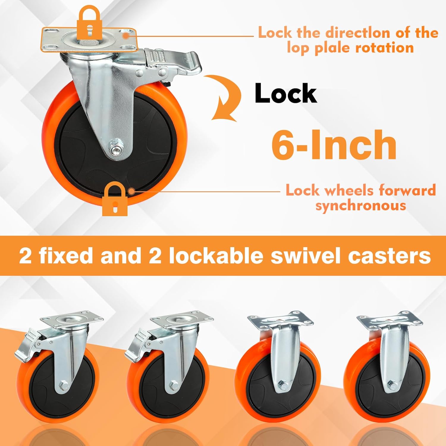 - π PROFESSIONALLY DESIGNED WHEELS: 2 fixed and 2 swivel 6-inch wheels (2 with Brake) are made of industrial-strength polypropylene and non-marking polyurethane (PU) rubber. The swivel wheels can easily rotate 360 degrees flexibly, and the inner double ball bearings make the rotation and rolling more effortless and labor-saving. The locking mechanism synchronously locks the rotation and the wheel frame, thus achieving effective and fast braking.