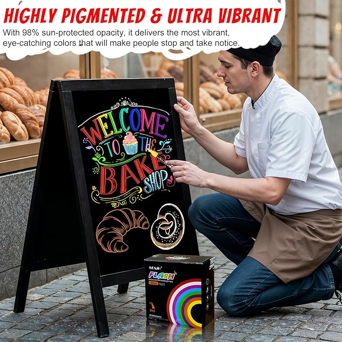 - γMore Vibrant ColorsγSFAIH 24-color chalk markers for blackboard uses high-concentration Italian ink to cover any background effortlessly, visible up to 50 feet with neon-like brightness. 4 metallic chalk markers shades infused with pearlescent particles deliver gilded finishes for calendars or window art. Liquid chalk markers premium pigment formula withstands 21 days of outdoor weathering and sunlight while maintaining original vibrancy.