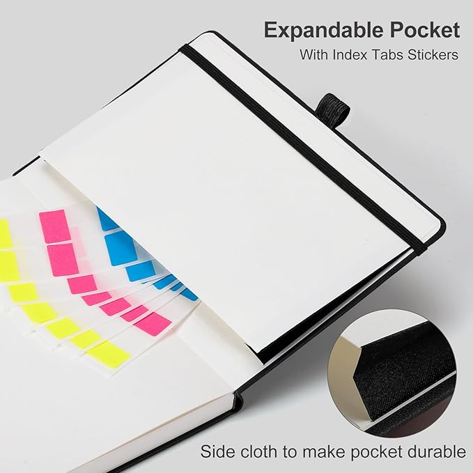 - CONVENIENT AND PRACTICAL LAYOUT: Features a pen holder for easy access to your pen, an elastic band to keep your notebook securely closed, 2 bookmarks for quick page referencing, an inner pocket for storing loose papers, and 18pcs sticky notes for additional organization and reminders