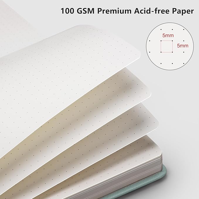 - PREMIUM PAPER: Crafted with time-resistant 100 GSM paper, this dotted journal preserves thoughts flawlessly while resisting ghosting/bleed-through with most pens. Acid-free material ensures long-term preservation, and its smooth surface enhances writing clarity - blending durability and premium performance