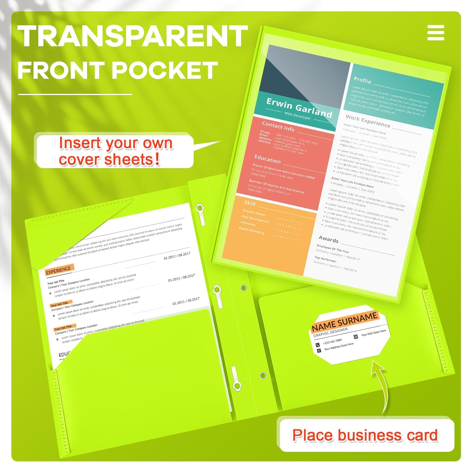 - Practical and Useful: with a clear front pocket, you can put your catalog, tables, favorite reports, presentations and more for clear display; Each plastic folder has 2 internal pockets to help organize and store your letter sized paper and documents; There are also 3 prongs to secure your 3-hole loose leaf paper in case it falls, and the card slot can hold your ID card or business card, practical for your daily work