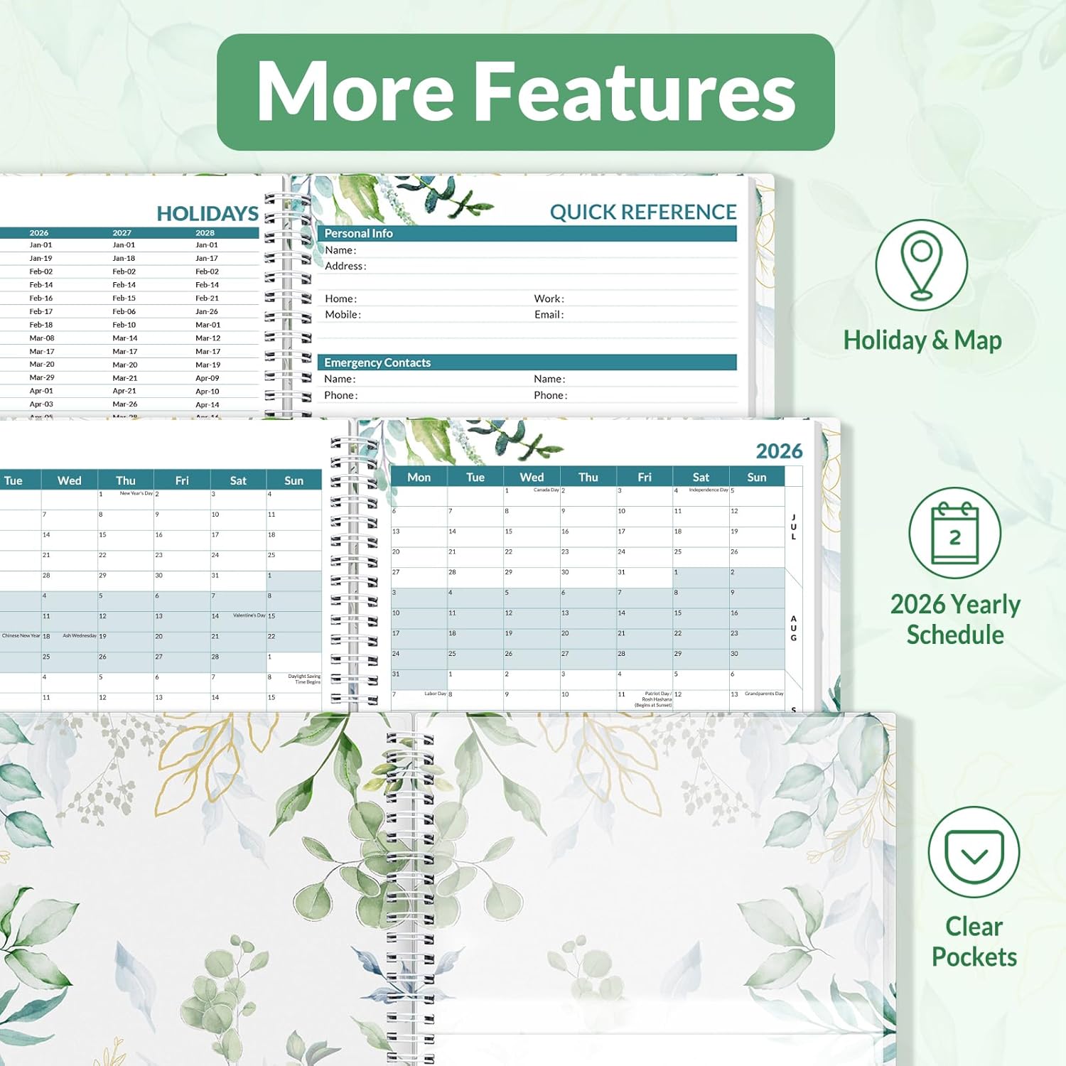SUNEE 2026 Weekly and Monthly Planner - from January 2026 - December 2026, 6.4" x 8.3" Daily Agenda Planner with Monthly Tab, Flexible Cover, Note Pages, Pockets, Bookmark, Spiral Binding, Greenery