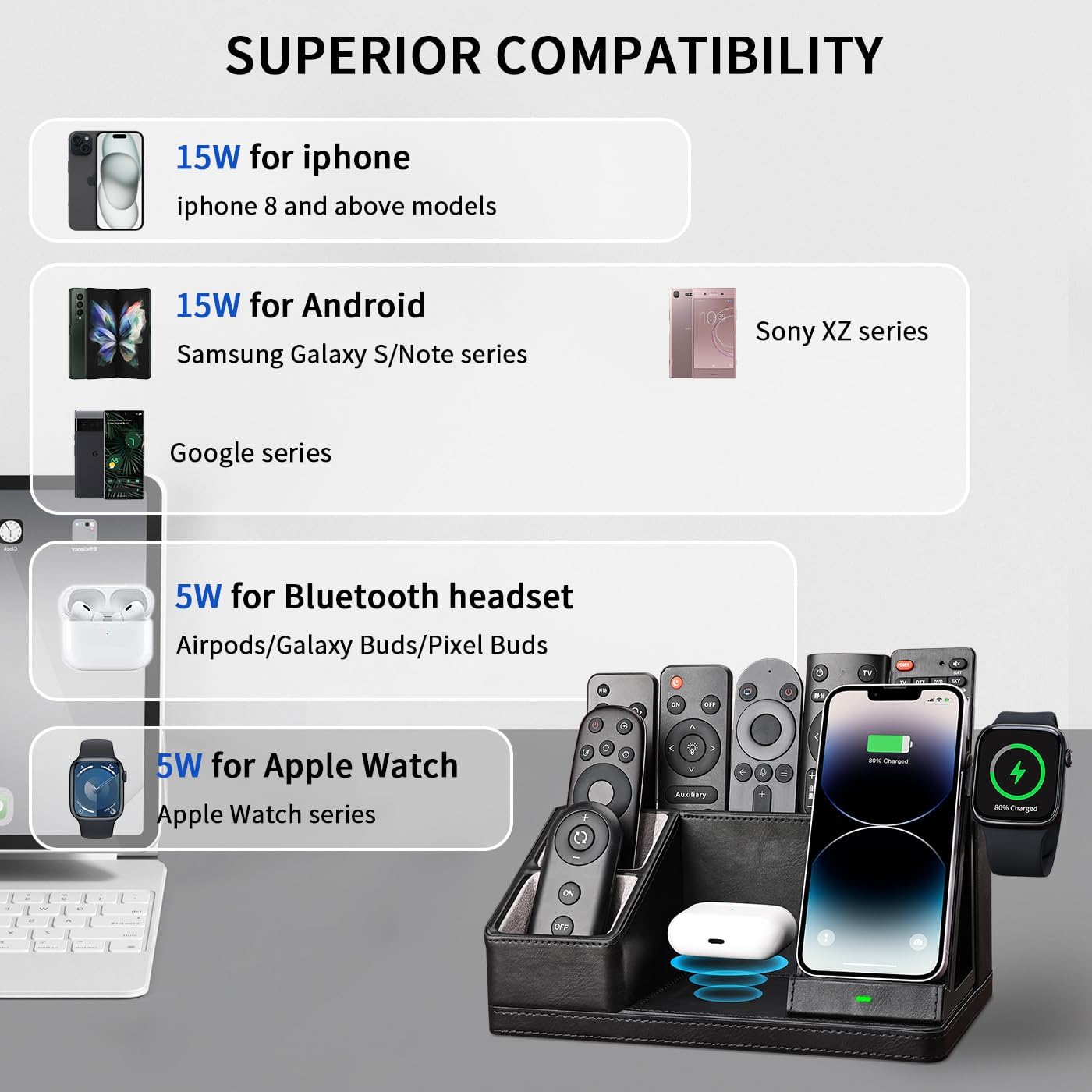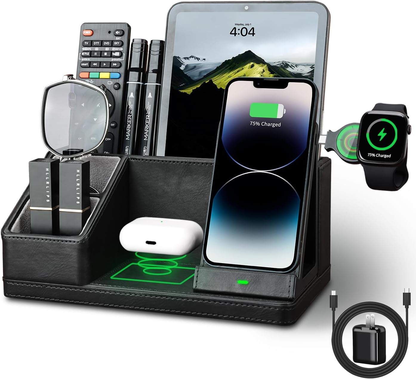 - βΆγMulti-Functional Organizer with Charging Stationγ: This all-in-one desk organizer with wireless charging station, with dedicated spots made for your iPhone/Apple Watch/AirPods charging at the same time; and keeping your pens, remote control, glasses, and other daily-used small things. Say goodbye to tangled cords and enjoy wireless charging by simply laying your device on the charging stand, no more plug-in/ out troubles.