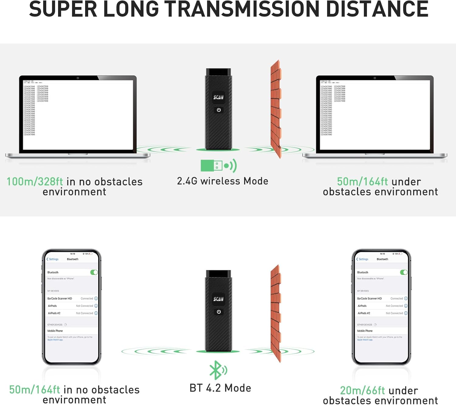 - 【More Connection Ways】: You can according to your needs to switch between 2.4G wireless/Bluetooth/USB wired three types of connection mode more convenient . also onewscan Bluetooth barcode scanner delivers up to 30m/98ft transmission distance in barrier free under the 2.4G wireless mode, up to 50m/164ft transmission distance barrier free under the Bluetooth mode.