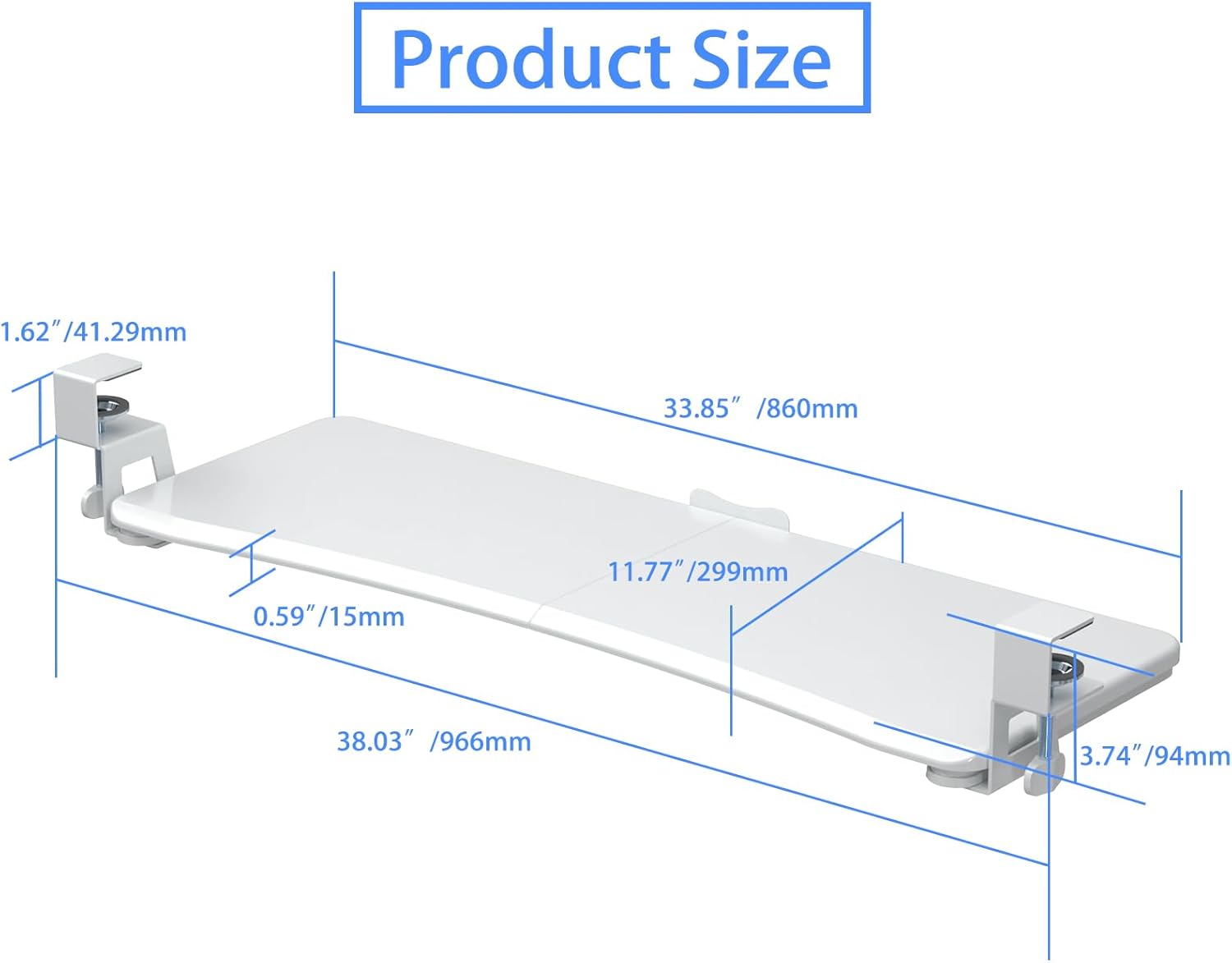 - Universal - This 34" (38" including clamps) x 11.8" under-desk keyboard tray holds your keyboard, mouse, and other small accessories below the desktop to add work space. Please not it does NOT fit if your desk thickness is over 1.57β.