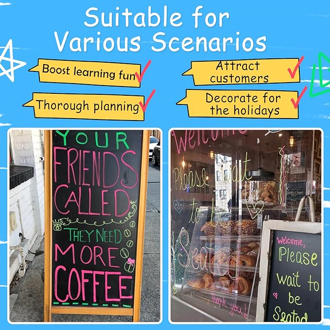 - Easy to Clean: The chalk markers are washable and can be wiped away effortlessly with a damp cloth, leaving no residue behind. Ideal for frequent use and quick changes, these dry erase markers for blackboards and erasable markers for whiteboards make clean-up hassle-free.