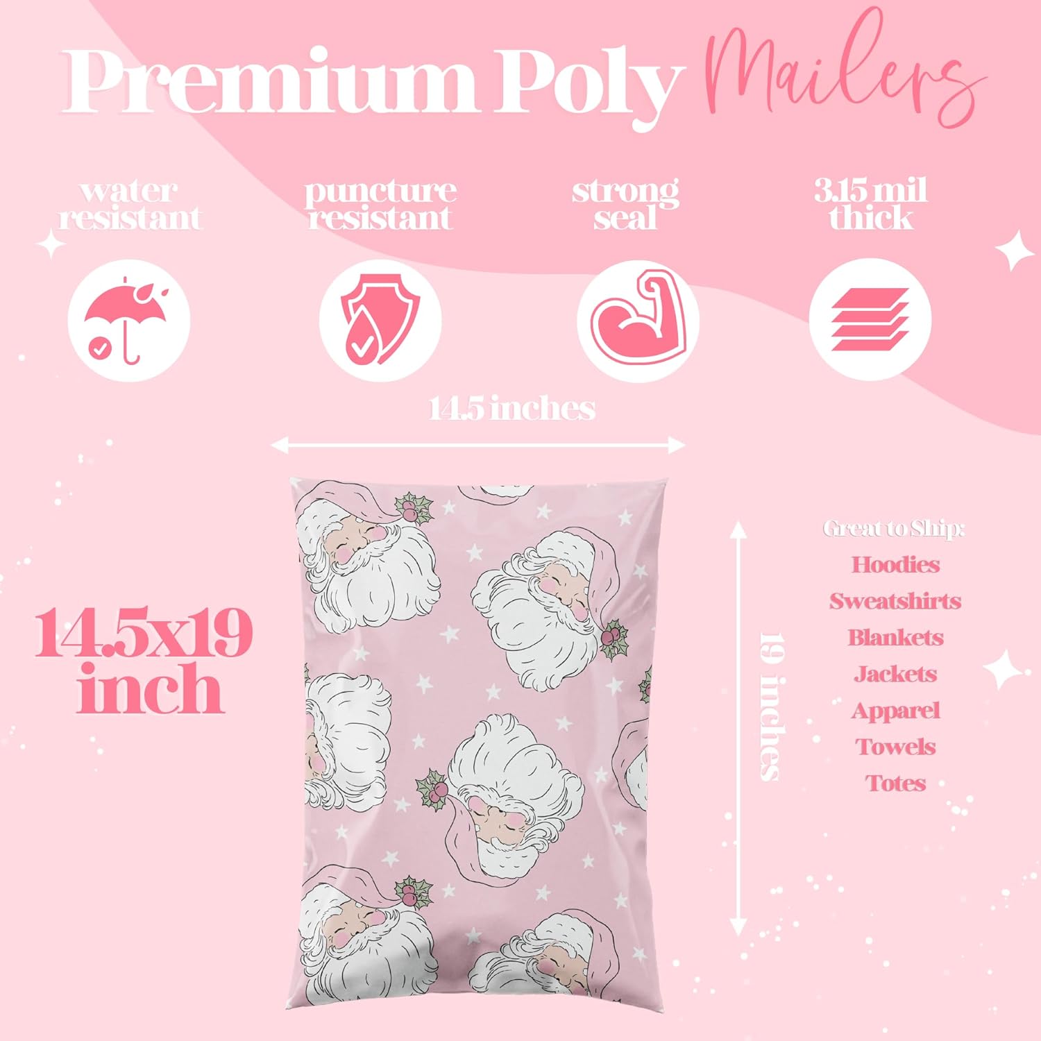 10x13 Designer Christmas Holiday Poly Mailer 100 Pack Heavy Duty Waterproof Self Seal Shipping Bags Large Mailing Envelopes Bulk Tear Resistant Cute Packaging Pink Santa
