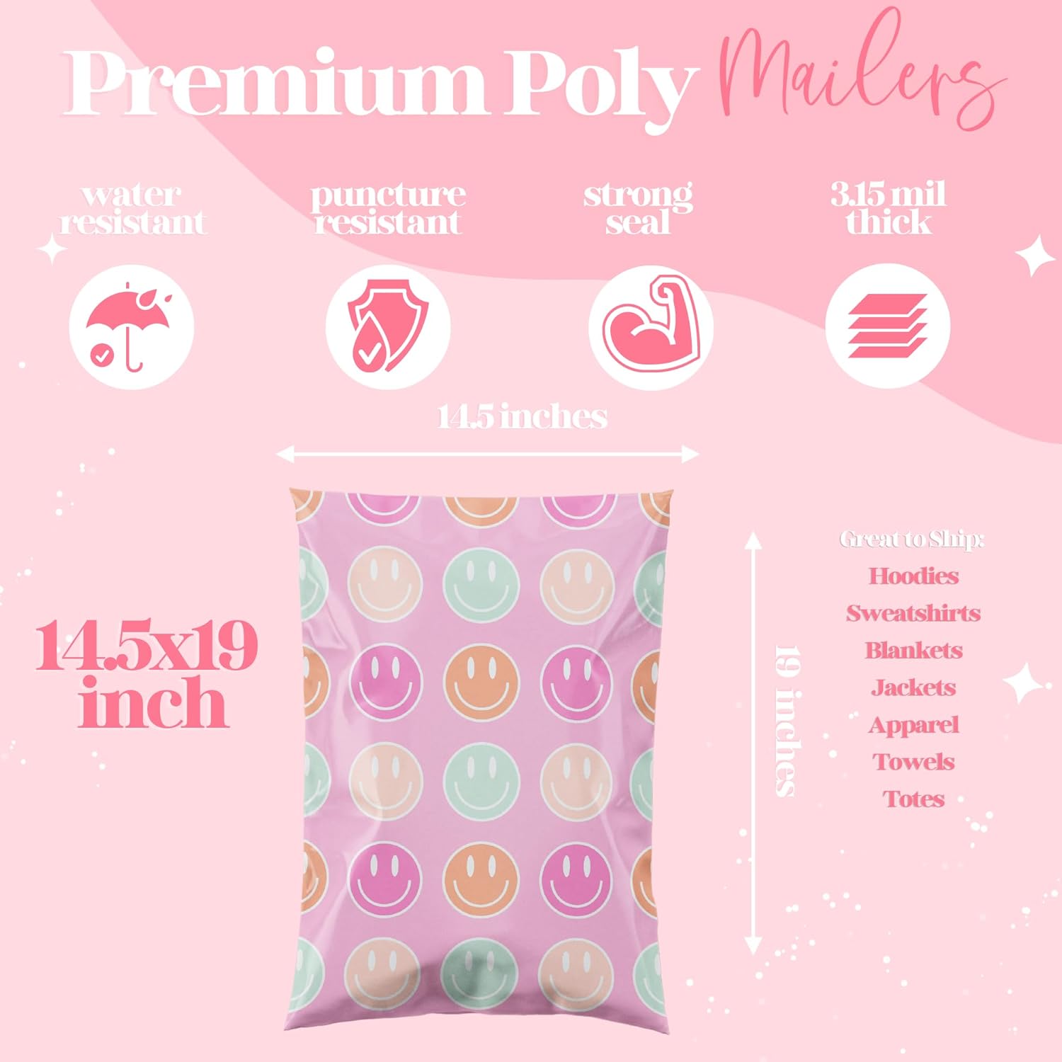 6x9 Designer Poly Mailer 100 Pack Heavy Duty Waterproof Self Seal Shipping Bags for Small Business Large Mailing Envelopes Bulk Tear Resistant Cute Packaging Smiley Face