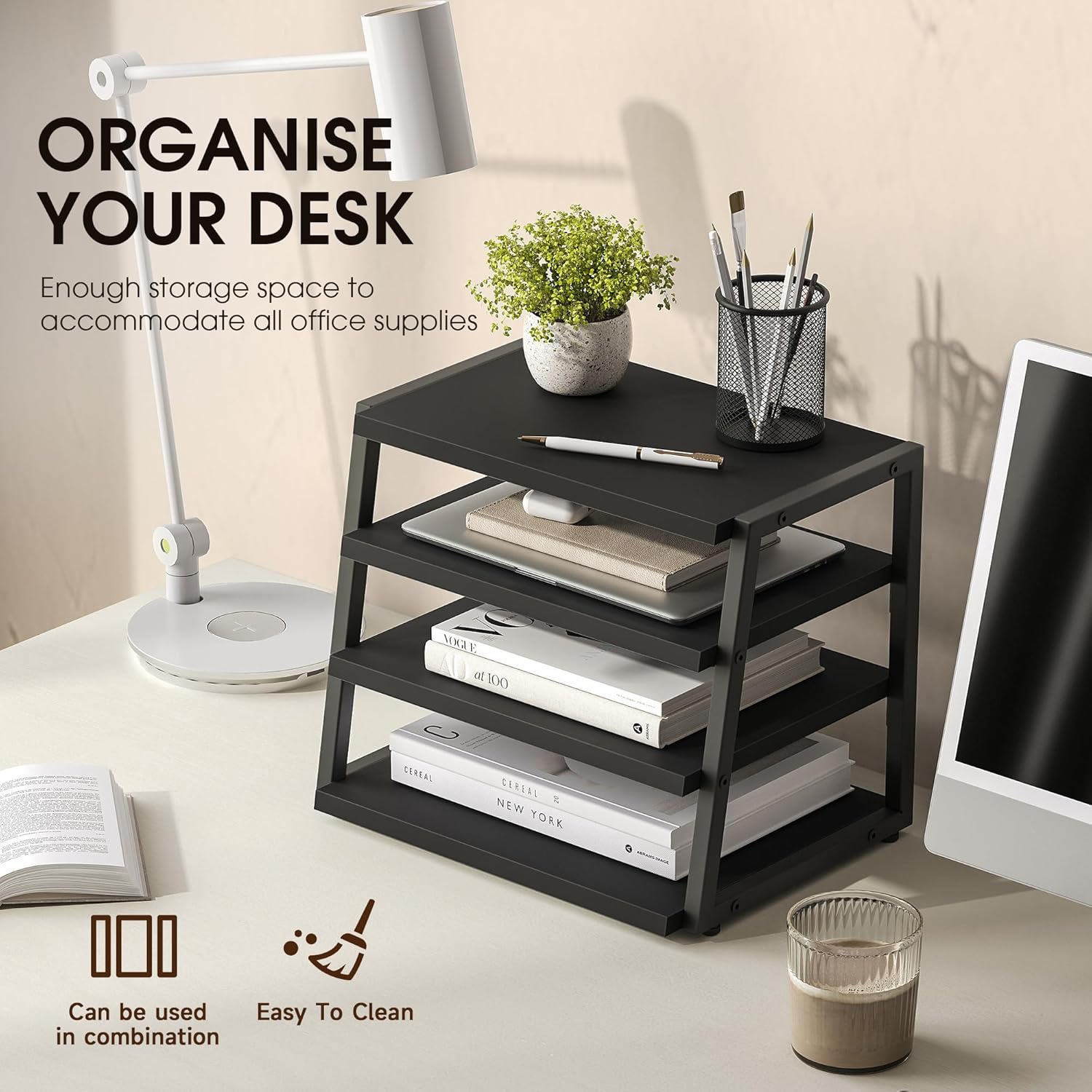 - γBoost Your EfficiencyγThe Fenge 4 tier desk organizer features an innovative open design, allowing you to neatly organize A4 paper, notebooks, books and desk accessories. With its 4-tier structure, you can categorize and access various files effortlessly. Keep important documents and office supplies within easy reach for quick retrieval and avoid the hassle of searching through clutter.
