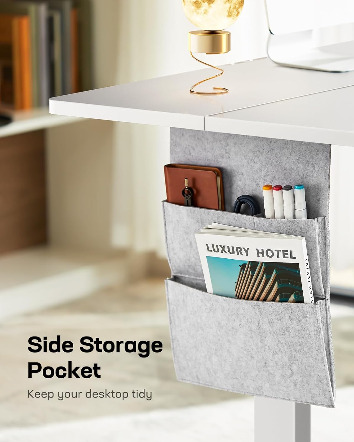 - Multifunctional Side Storage Pocket: This double-layered pocket keeps your workspace clutter-free by storing folders, notebooks, and office supplies. It provides easy access to essentials without using desk space. The ample storage capacity allows organization of documents, writing tools, and electronics. Reducing clutter fosters focus and productivity, while seamlessly integrating with the desk's design enhances the workspace's visual appeal.