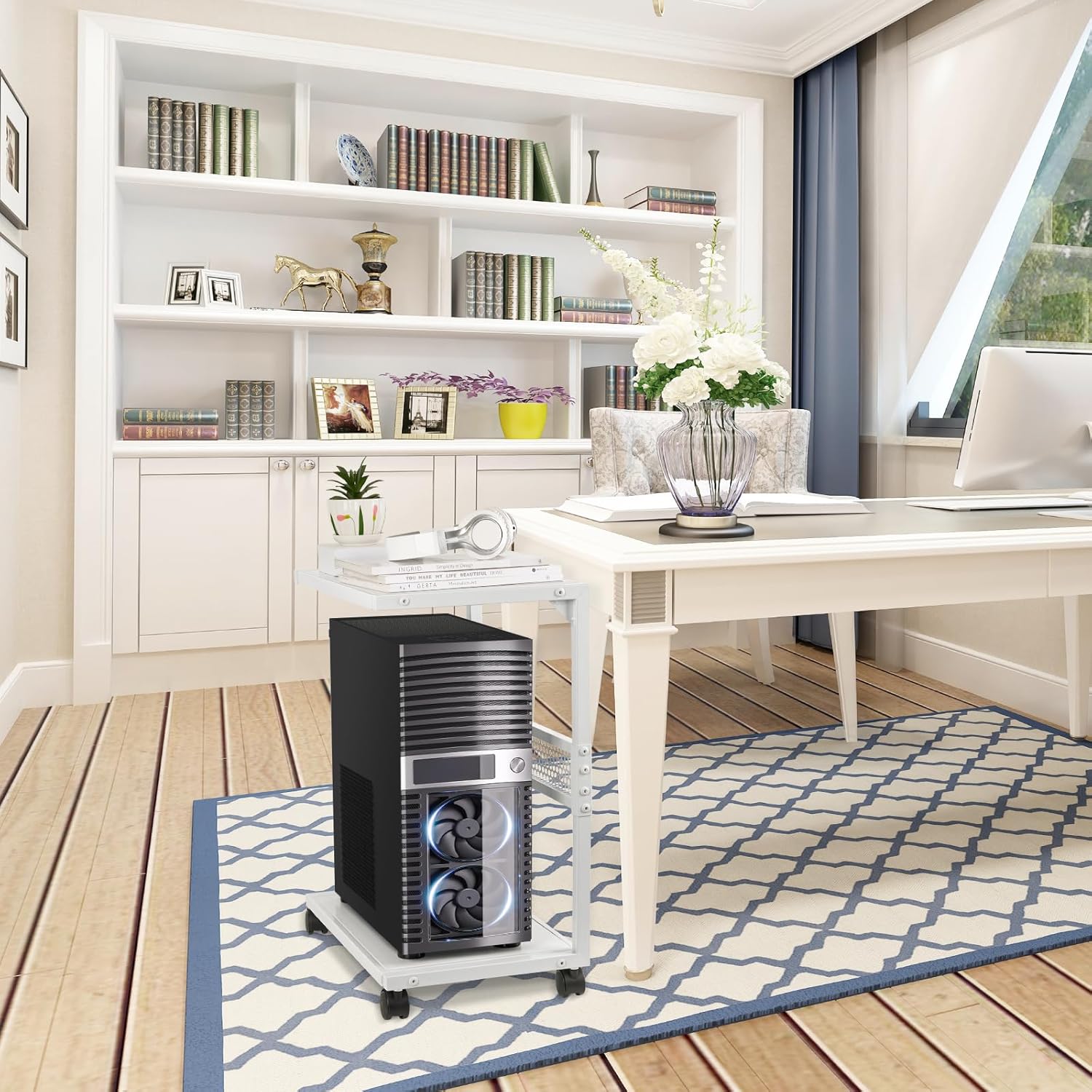 - Mobile PC Tower Stand: Four 360Β°rotating universal wheels are easy to move, and braked casters can keep it stationary when needed. The CPU stand lifts the PC chassis off the ground, which helps speed up the cooling speed of the PC chassis.
