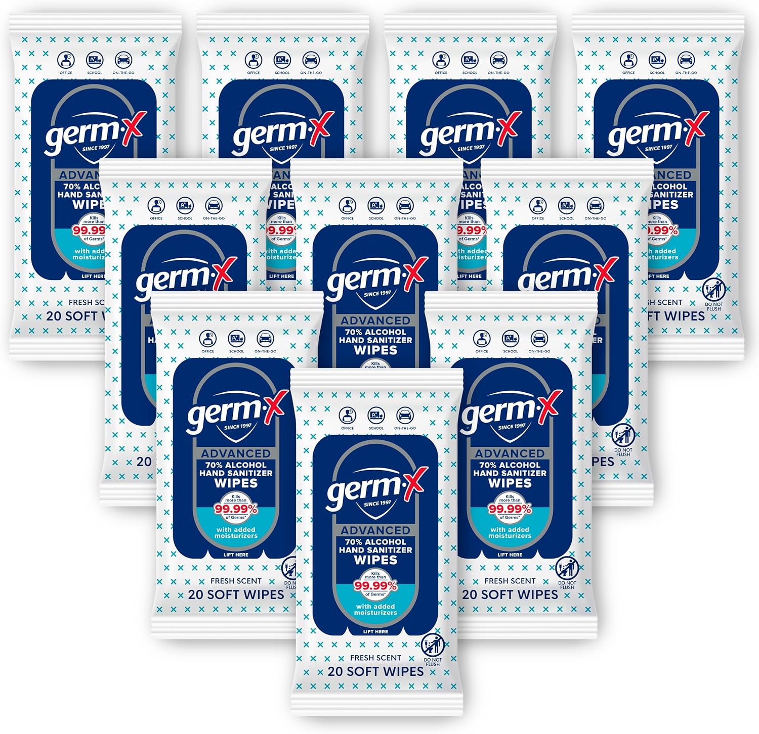 Germ-X Advanced Single-Use Hand Sanitizer Wipes, 20 Soft Wipes, Non-Drying Hand Sanitizer, Instant No Rinse Formula, Back to School Supplies, 70% Alcohol-Based Moisturizing Hand Sanitizer (Pack of 10)