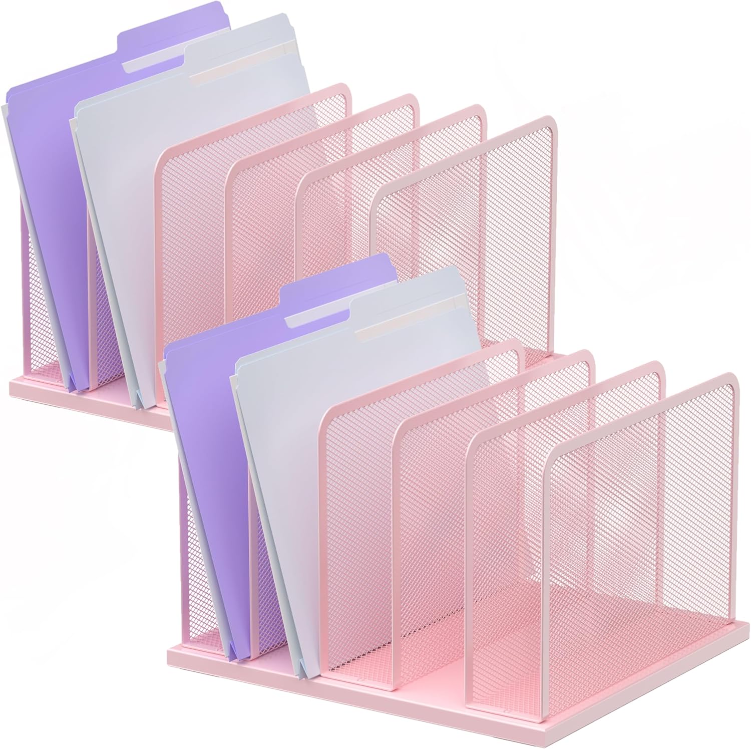 Kuntine.B Desk File Organizer Upright Mesh Desktop Organizer File Sorter Office Organization File Holder for Home, Office & Classroom (Pink, 2 Pack 5-Section)