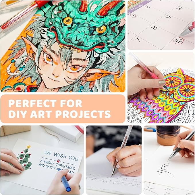 - Safe and Variety of Uses :Good quality, non-toxic,very smooth and easy to use.The coloring pens are best for everyone to use in daily life or school work.colorful gel pens are so fun to use for Adult Coloring Books, Scrapbook, Journal, Drawing, Doodling, Coloring, School Projects, Decorations, Home-Made Invitations, Greeting Cards, and so much more.