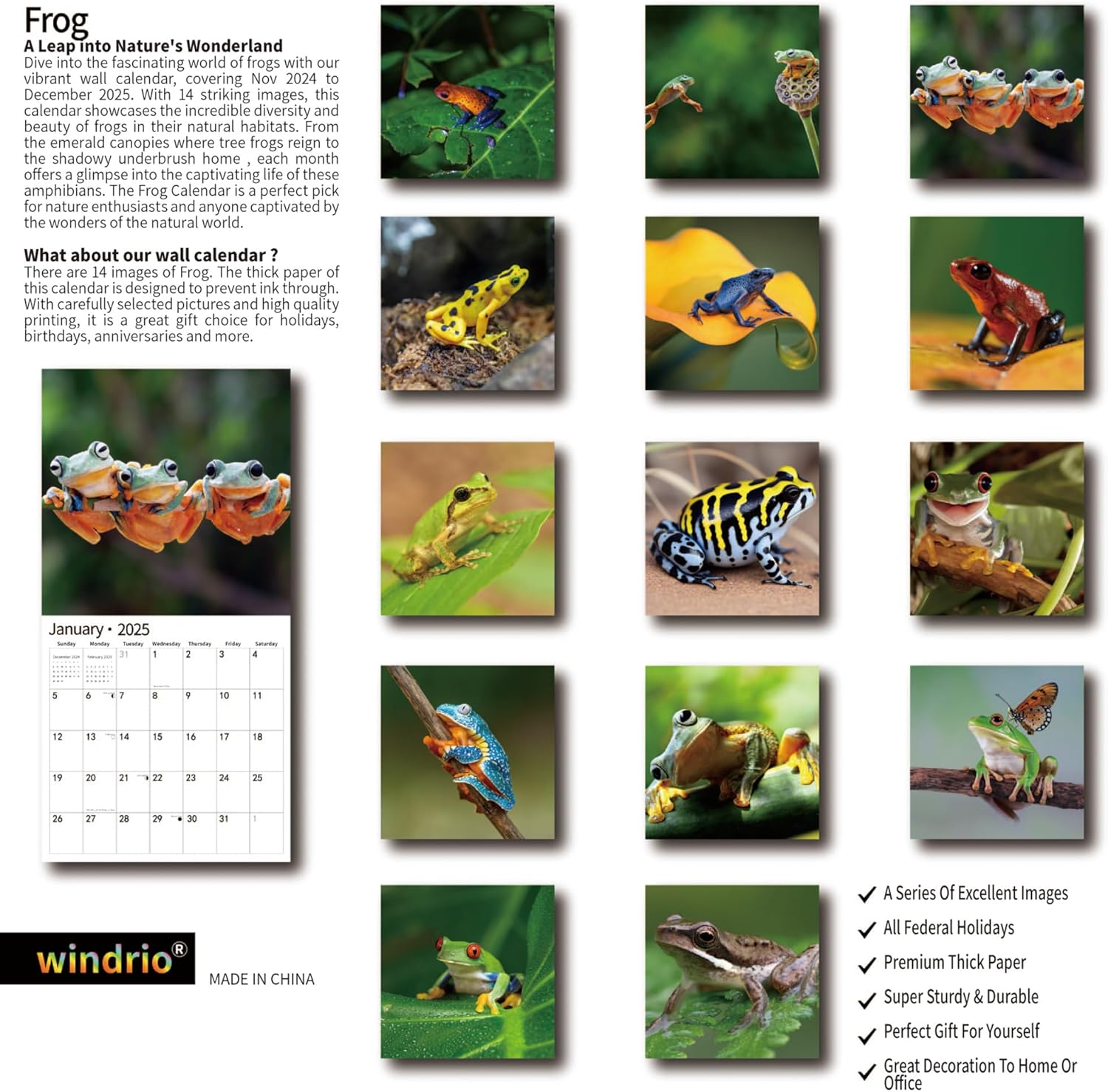 - A LEAP INTO NATURE'S WONDERLAND: Dive into the fascinating world of frogs with our vibrant wall calendar, covering November 2024 to December 2025. From the emerald canopies where tree frogs reign to the shadowy underbrush home , each month offers a glimpse into the captivating life of these amphibians. The Frog Calendar is a perfect pick for nature enthusiasts and anyone captivated by the wonders of the natural world.