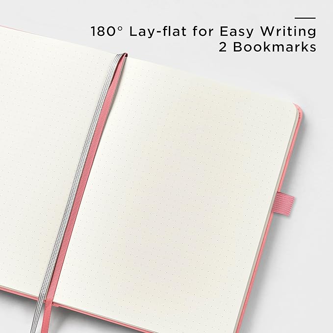 - 180Β° LAY-FLAT DESIGN: The lay-flat design allows for easy writing and ensures that you can utilize every page efficiently. Journaling, note-taking and planning has never been easier! 2 Bookmarks to help you find important content faster