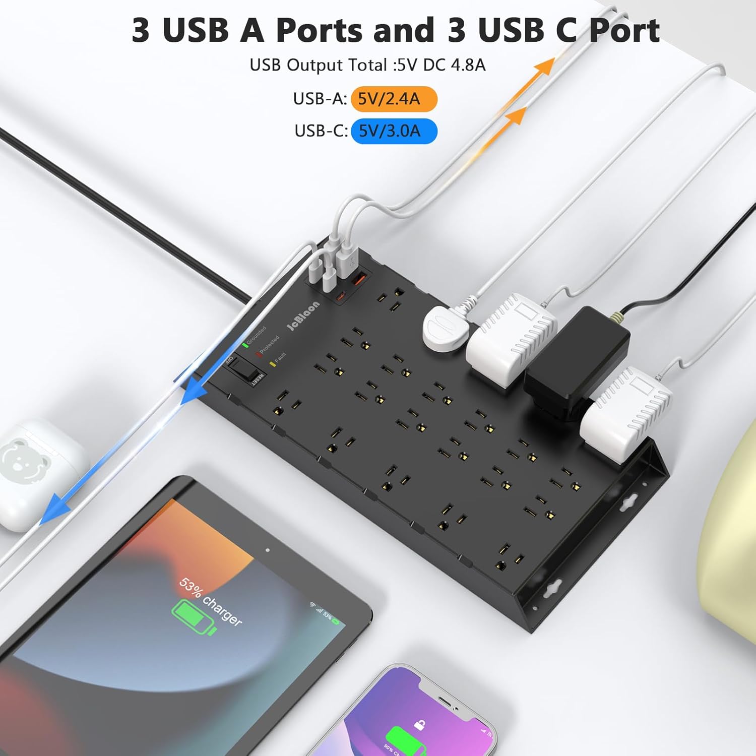 - 【Smart USB Fast Charging】 Jcblaon power strip multifunctional socket is a great upgrade with built-in intelligent IC technology and a high-speed surge protector with USB interface that automatically detects charging devices and provides the best charging speed. It has 3 UBS-A and 3 USB-C charging ports, and USB-C provides the fastest charging speed, up to 5V/3A,USB Output Total 5V/4.8A.It can charge up to 6 USB devices simultaneously without the need to find an adapter or plug for your USB device.
