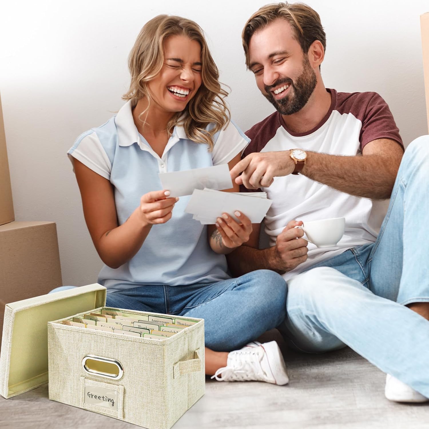 Vienrose Greeting Card Organizer 2 Pack, Storage Box with 20 Adjustable Dividers, Foldable Organizer Box Holds over 150 Cards, Storage Stickers Recipes Photos Envelopes Bills Vinyl Records, Beige