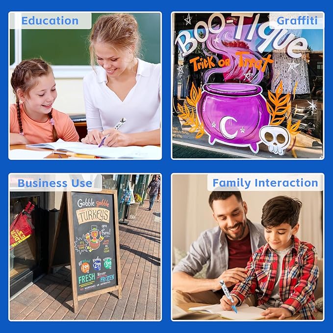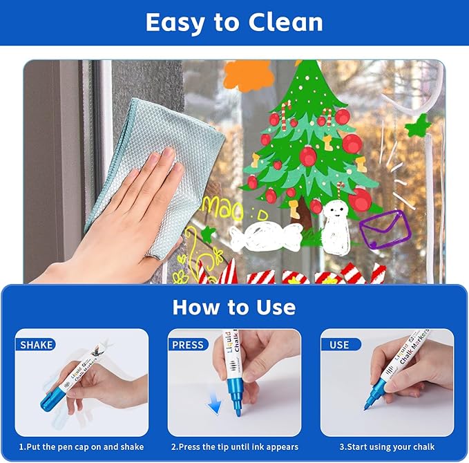 - Easy to Use & Clean: Our liquid chalk markers erasable are designed for effortless application and clean-up. To use, simply put the cap back on, shake the marker thoroughly, press the tip to saturate it with ink, and test it on paper. Erasable markers are designed for easy cleanup on any chalkboard, windows, glass, or other non-porous surfaces. With just a dry or damp cloth, you can erase vibrant designs made with chalk pen, and start fresh.