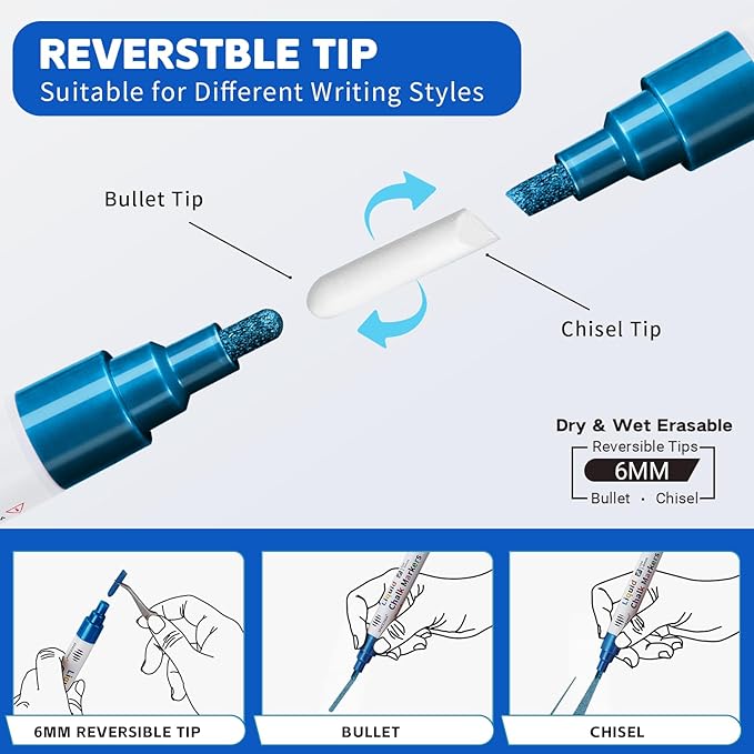 - Reversible Tips for Versatile Use: The 6mm tips on our chalk pens for chalkboard are reversible, offering you the choice of a bullet or chisel tip. Whether you're adding delicate details or making bold statements, the reversible tips make it easy to adapt to your project's needs. Our chalkboard markers work smoothly on chalkboards, glass, metal, and more, allowing you to switch between fine lines and broad strokes for ultimate creative freedom.