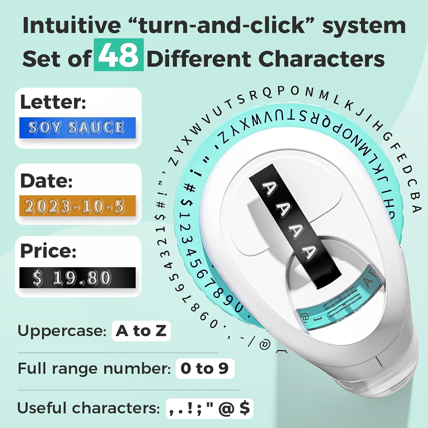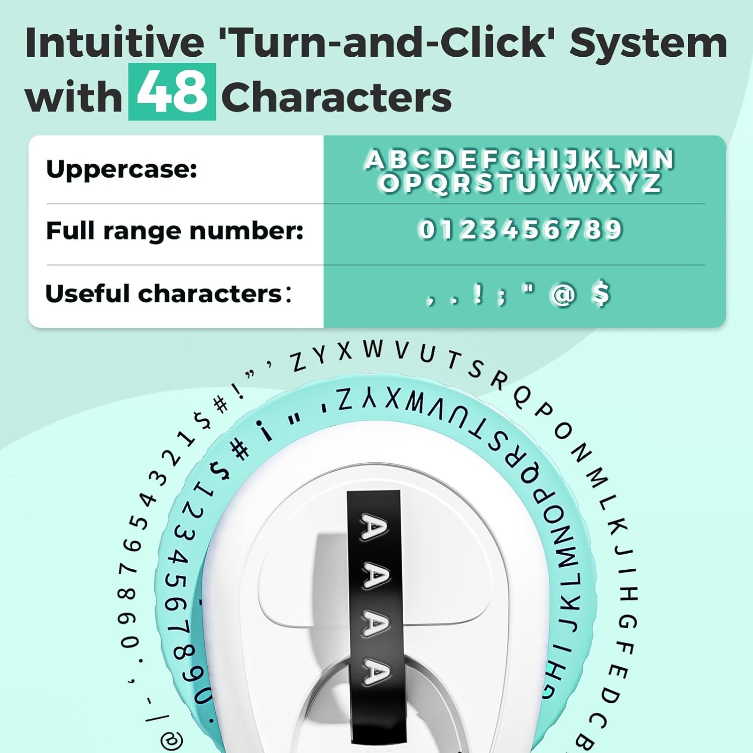 - Simple Label Maker: The Portable Embossing Label Maker with a turn-and-click system simplifies the labeling process, offering 48 useful characters. English letters "A TO Z", numbers : "0 to 9 " , and common symbols " - ! @. , οΌββ $ # ". Sufficient to meet your use needs