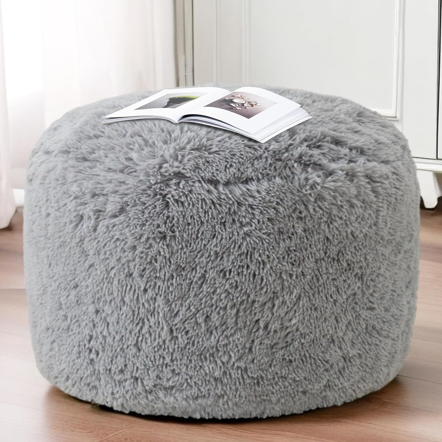 HIGOGOGO Round Stuffed Pouf Ottoman, Long Faux Fur Poufs with Foam Chunk Filling, Fluffy and Furry Pouf Foot Stool Storage Ottoman, 26 X 18 Floor Poufs Foot Rest for Living Room, Light Grey
