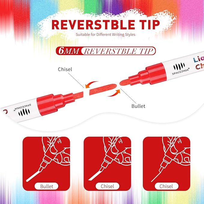 - Reversible Tips for Versatile Use: The 6mm tips on our chalk pens for chalkboard are reversible, offering you the choice of a bullet or chisel tip. Whether you're adding delicate details or making bold statements, the reversible tips make it easy to adapt to your project's needs. Our chalkboard markers work smoothly on chalkboards, glass, metal, and more, allowing you to switch between fine lines and broad strokes for ultimate creative freedom.